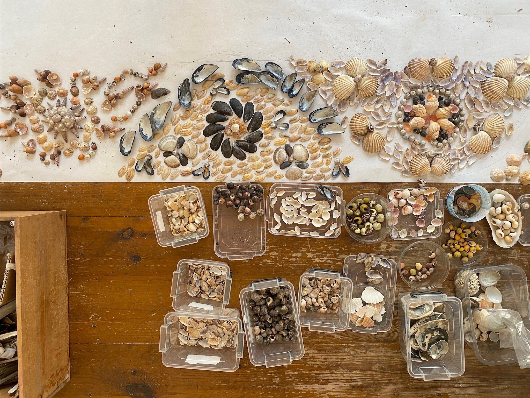 The proximity to the ocean led us into a watery world of mythical sea creatures, Victorian pressed seaweeds, local coastal foliage, and a foray into shellwork Frescos by Alice and her sister Chloë. Local historical archery society emblems, existing stained glass, and the shifting sands of nearby Camber all helped guide our aesthetic vision. We wanted to preserve traces of the last owner, a local artist, keeping some floors untouched and the exterior in a bleached blue copper ore.